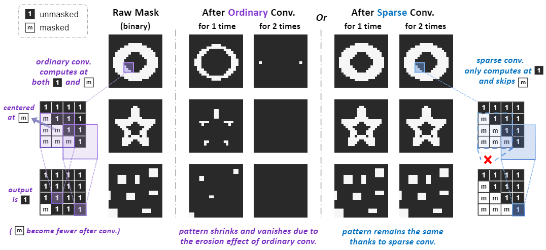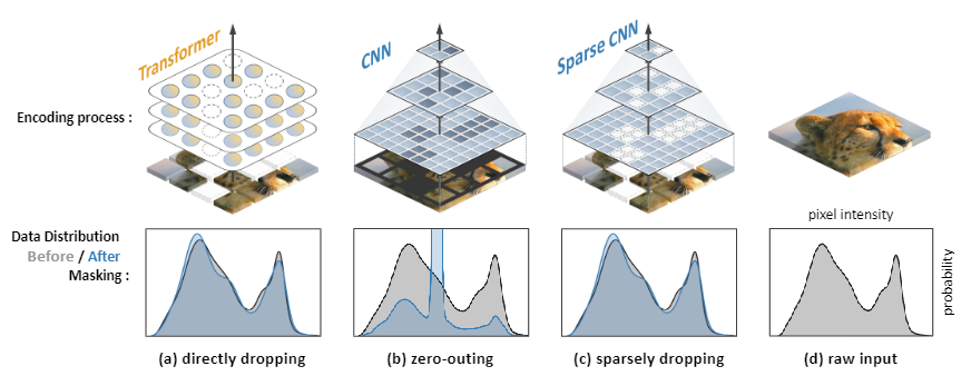 如上图所示,对于一个masked的输入图片,对ViT输入和CNN的输入计算统计直方图,ViT的直方图是和未mask的图片分布一致的,而CNN的直方图发生了很大变化。这是由于ViT结构天然适合处理变长、不规则的输入,且不同的输入之间不会重叠计算。CNN的滑窗操作和规则的卷积核形状,导致模型会严重受到mask部分的影响。
