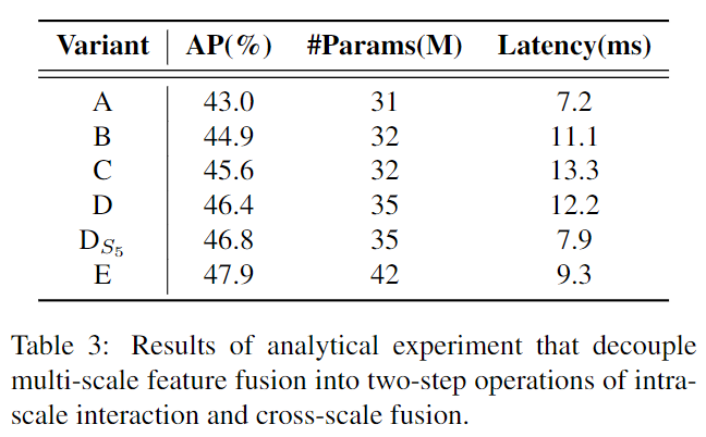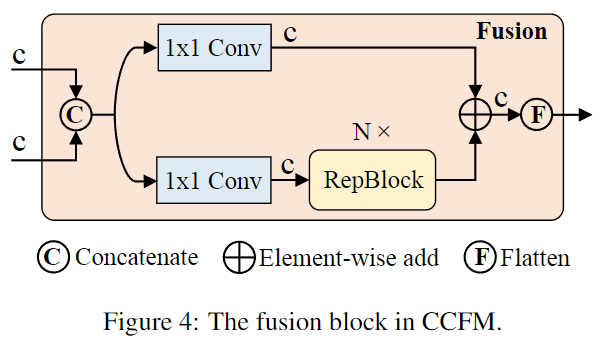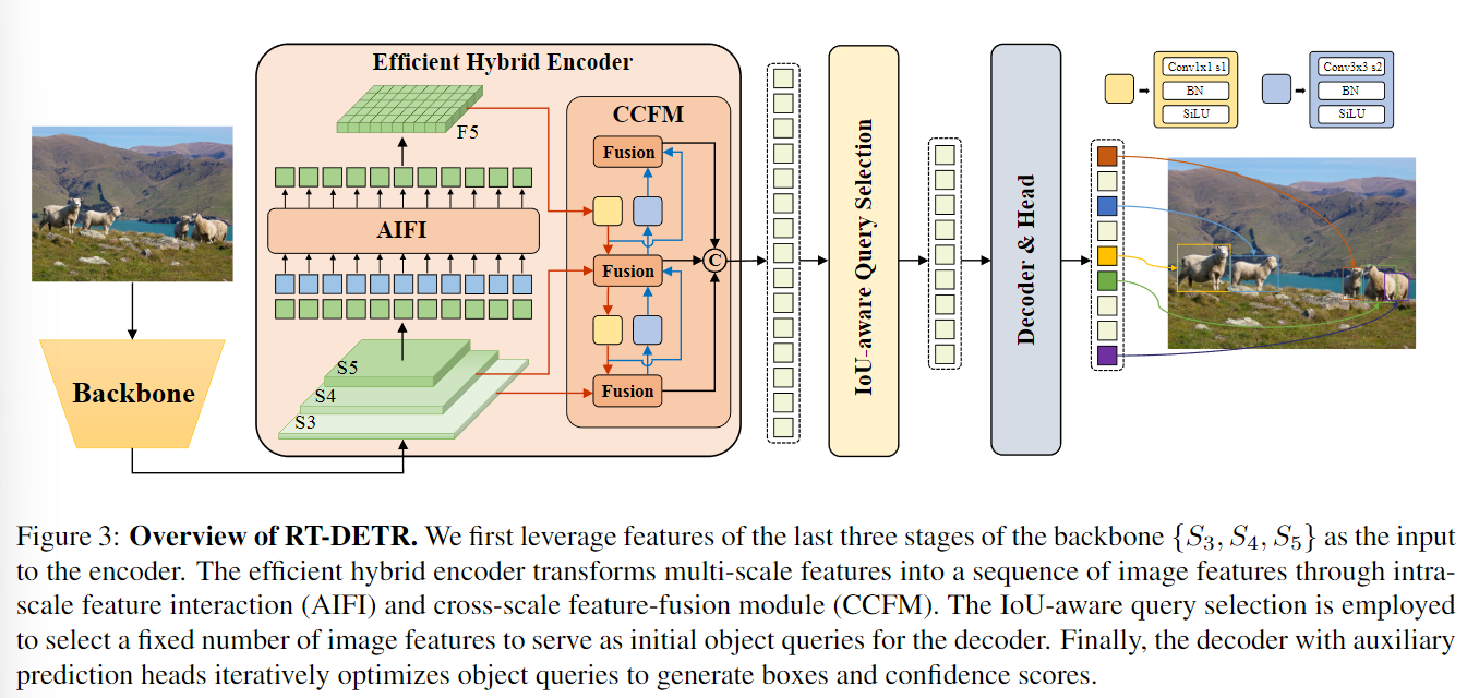 该方法的总体框架如上图所示,该模型首先只是用骨干网络输出的最后三层特征图。作者提出了解耦的编码器结构,设计了AIFI(尺度内特征交互)和CCFM(跨尺度特征融合)如下图所示,此外吧编码器层数从6层减少到1层,大大减少了计算量。此外训练时加入了IoU-Aware的查询选择机制,针对分类score和IoU未必一致而设计的,改进后可以提供更高分类分数和高IoU分数的解码器特征。另外作者通过控制transformer层数和Repblock数量实现了模型尺度的可调整性。