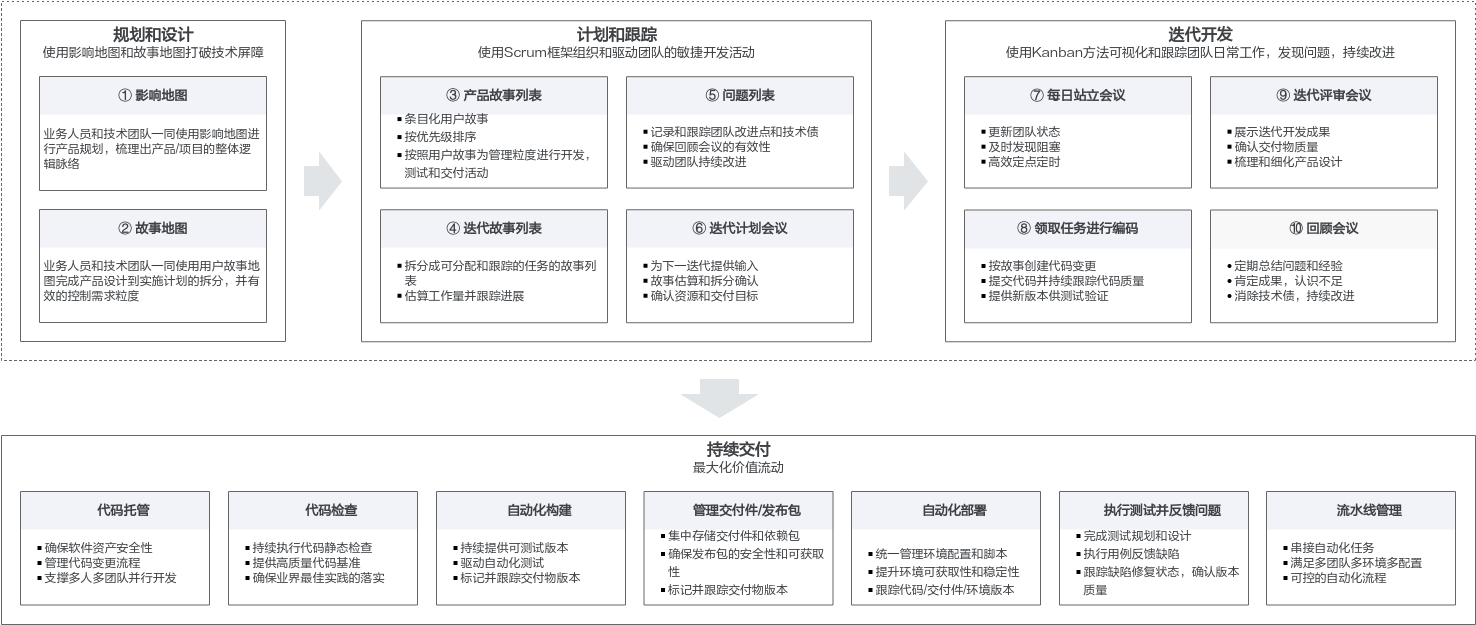 华为端到端(HE2E)DevOps实施框架,是结合了多年研发经验并集合了业界先进的实践所形成的一套可操作可落地的敏捷开发方法论(下图为实施框架图)华为云官网文档地址:官方文档链接