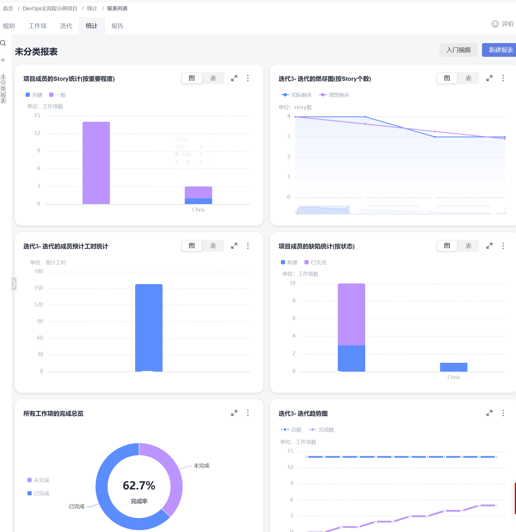 通过工作项中的统计,也可直观的看出项目完成度等数据(也可新建报表自行定义)