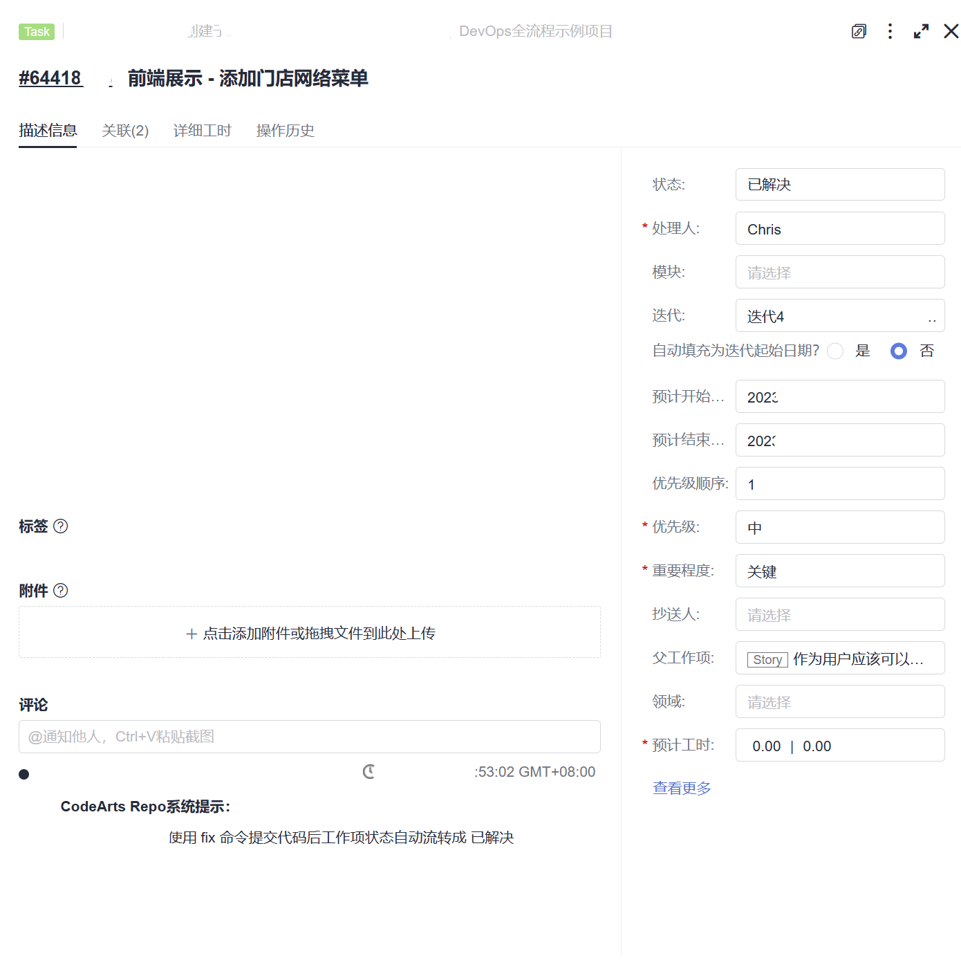 通过左侧工作项中的规划,可以清晰明了的看出整个项目的思维导图,并可通过点击每一步的思维导图标记,清晰的看到其中开始时间、重要程度等信息。其中思维导图可以通过拖拽的方式进行顺序的调整,不过在进行上下层级(父子级)调整时,需要考虑其关系是否能够进行调整,若是不可进行调整进行了拖动,则会报出父级关系错误的弹窗。