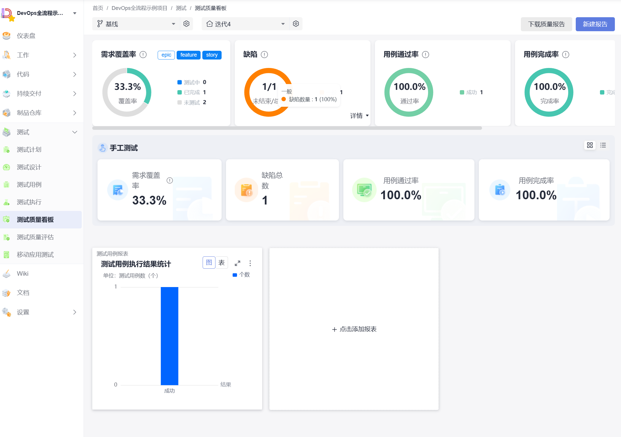 通过测试质量中的图表可以清楚的看出计划的进展,包含需求覆盖率、通过率等信息。