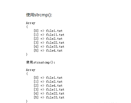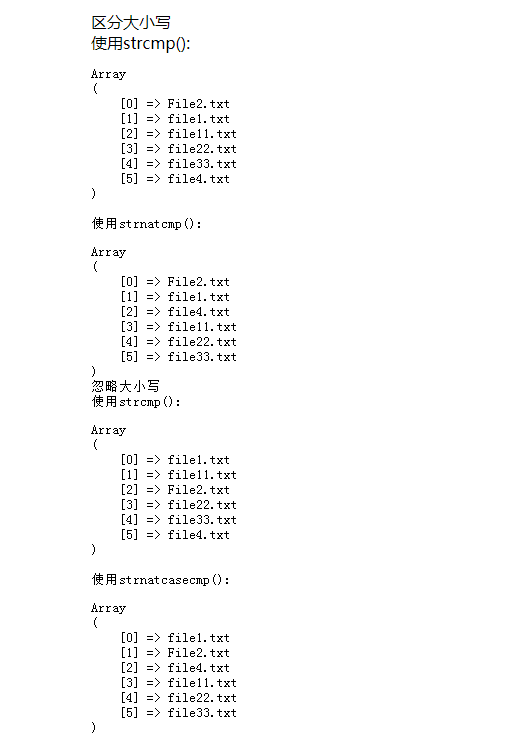 从结果就可以明显看出区别,在PHP中也提供了这个函数的忽略大小写的函数strnatcasecmp(),使用方法和strnatcmp()函数相同.