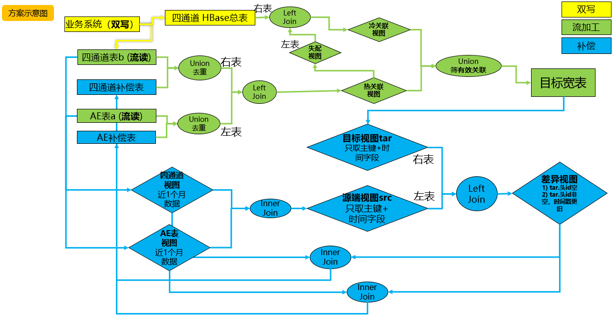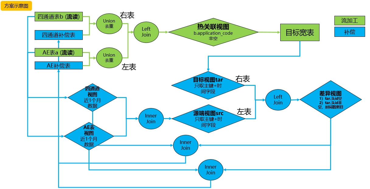 模型二特点:比较方案一增加补偿机制,能够对比源表(AE表,四通道表)以及目标宽表,找出缺失数据missing, delay。