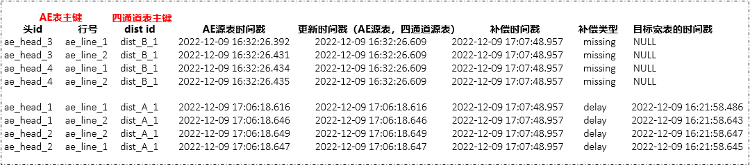 补偿目的:基于业务逻辑,对比源端流表和目的端宽表数据内容,发现目标宽表缺失数据主要字段,关联源表完整内容找出缺失数据,并写回源端表补偿层。