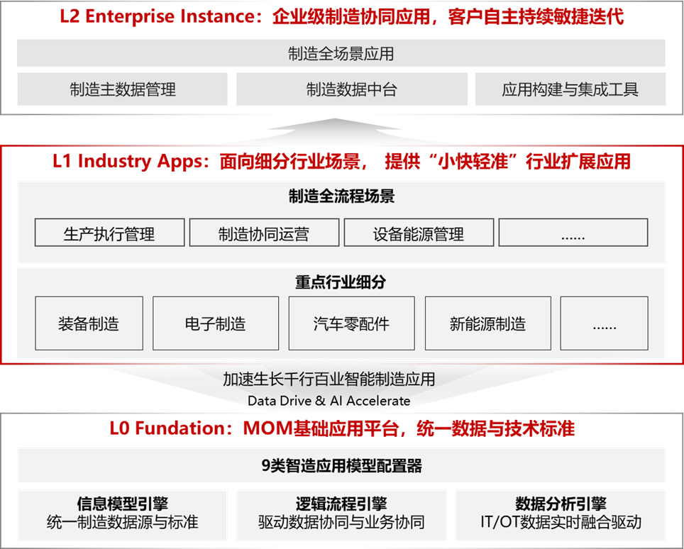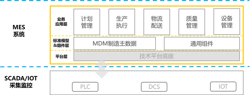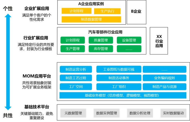 MES/MOM类生产系统的核心是业务流程驱动的各业务环节模块间高效紧密协同,要满足企业个性化需求及未来的扩展需求。对于MES和MOM来说,更有价值的不是按生产过程的业务环节或生产要素进行拆分,而是基于统一的数据与应用平台底座构建一体化的业务应用同时在框架层面进行分层扩展:平台基础模型层/行业扩展层/企业扩展层,真正解决MES/MOM类生产系统不同业务模块间可高效紧密协同,以及系统可快速定制、低成本可持续升级运维的问题。
