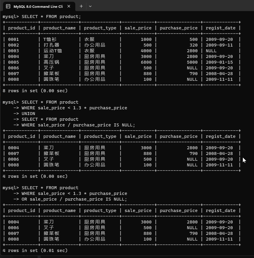 分别使用 UNION 或者 OR 谓词,找出成本利润率不足 30%或成本利润率未知的商品。