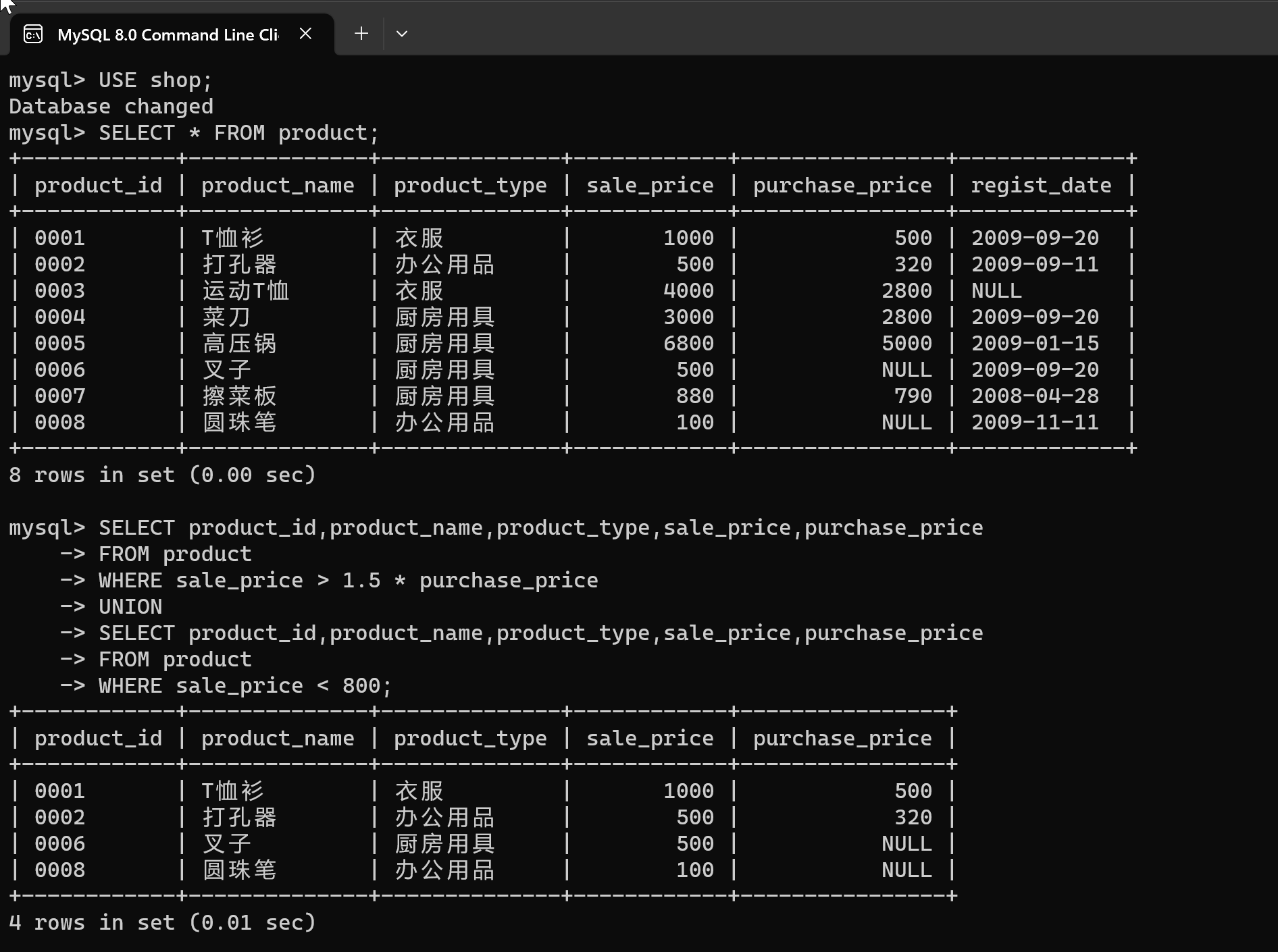 | 0001 | T恤衫 | 衣服 | 1000 | 500 |