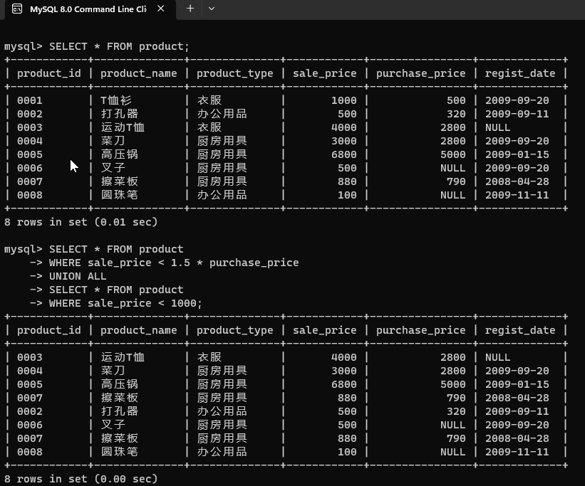 商店决定对product表中成本利润低于50% **或者** 售价低于1000的商品提价, 请使用UNION ALL 语句将分别满足上述两个条件的结果取并集. 查询结果类似下表: