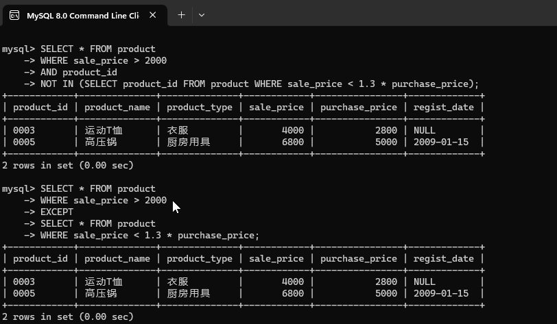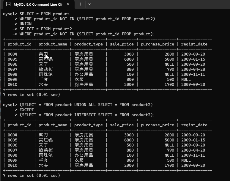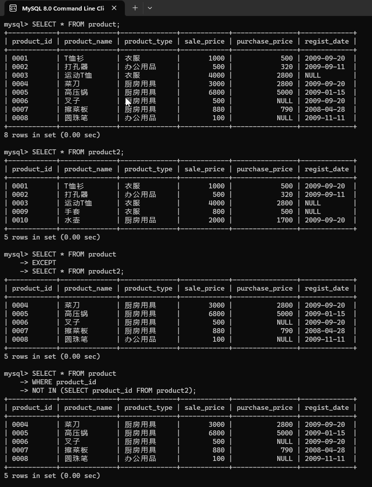 - EXCEPT:差集操作,返回在第一个查询结果集中存在,而在第二个查询结果集中不存在的行。