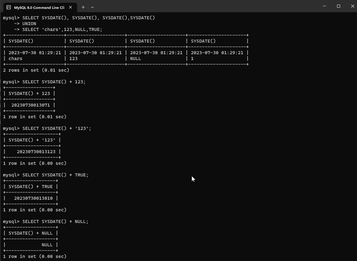 SELECT SYSDATE(), SYSDATE(), SYSDATE(), SYSDATE()