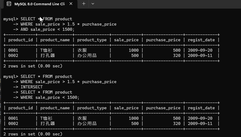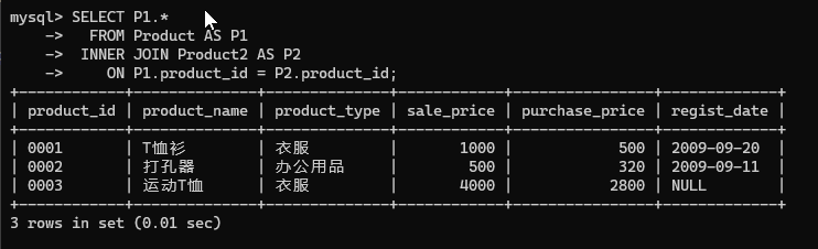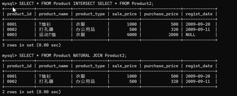 使用内连结求 Product 表和 Product2 表的交集。