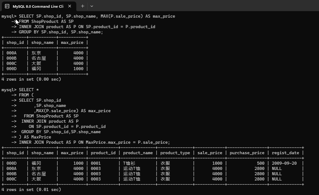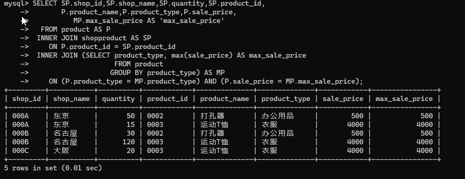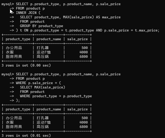 分别使用内连结和关联子查询每一类商品中售价最高的商品。