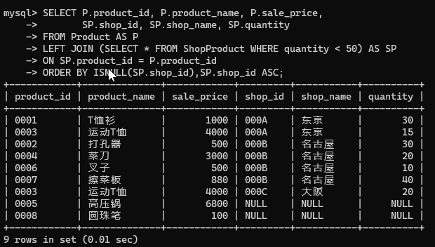 | 0006 | 叉子 | 厨房用具 | 500 | NULL | 2009-09-20 |