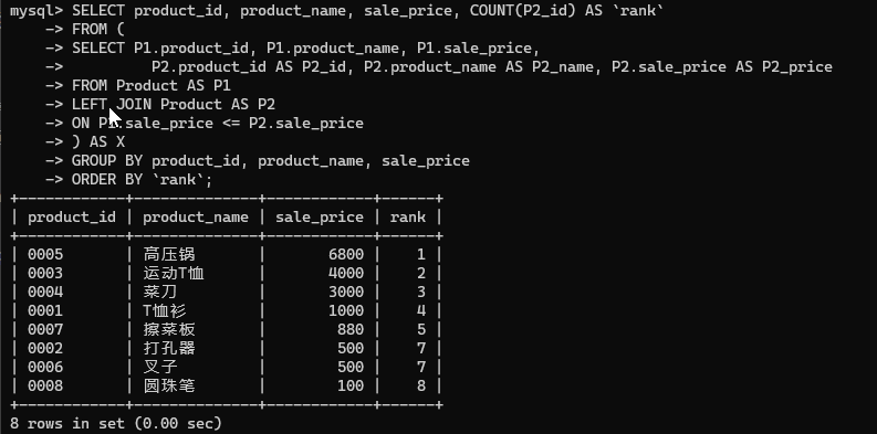 希望对 Product 表中的商品按照售价赋予排名. 一个从集合论出发,使用自左连结的思路是, 对每一种商品,找出售价不低于它的所有商品, 然后对售价不低于它的商品使用 COUNT 函数计数. 例如, 对于价格最高的商品,