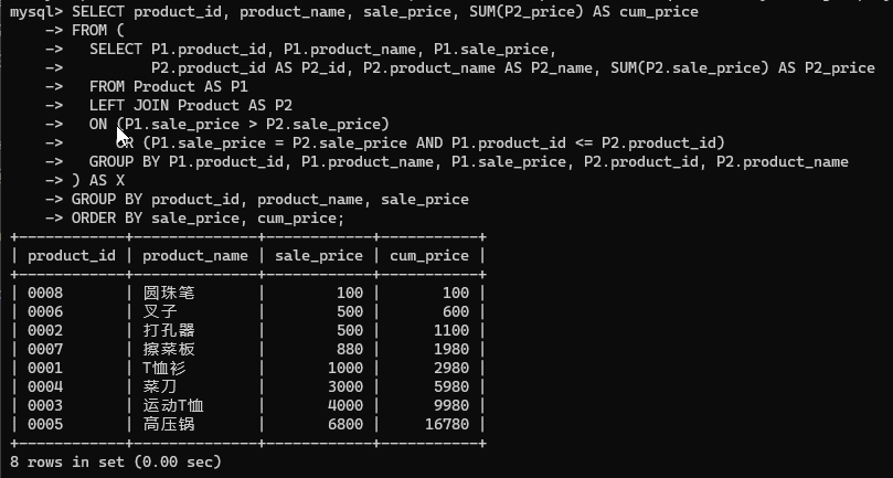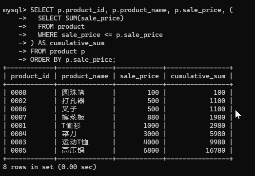 用关联子查询实现:在 product 表中,取出 product_id, product_name, sale_price, 并按照商品的售价从低到高进行排序、对售价进行累计求和。