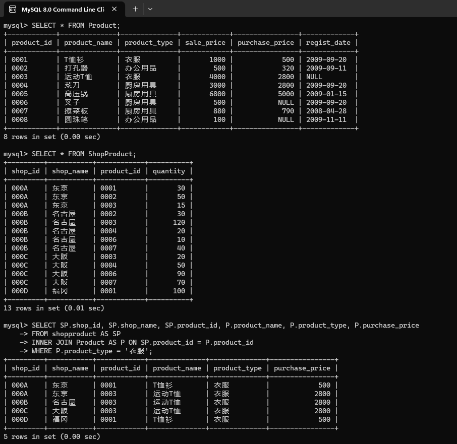 | 0003 | 运动T恤 | 衣服 | 4000 | 2800 | NULL |