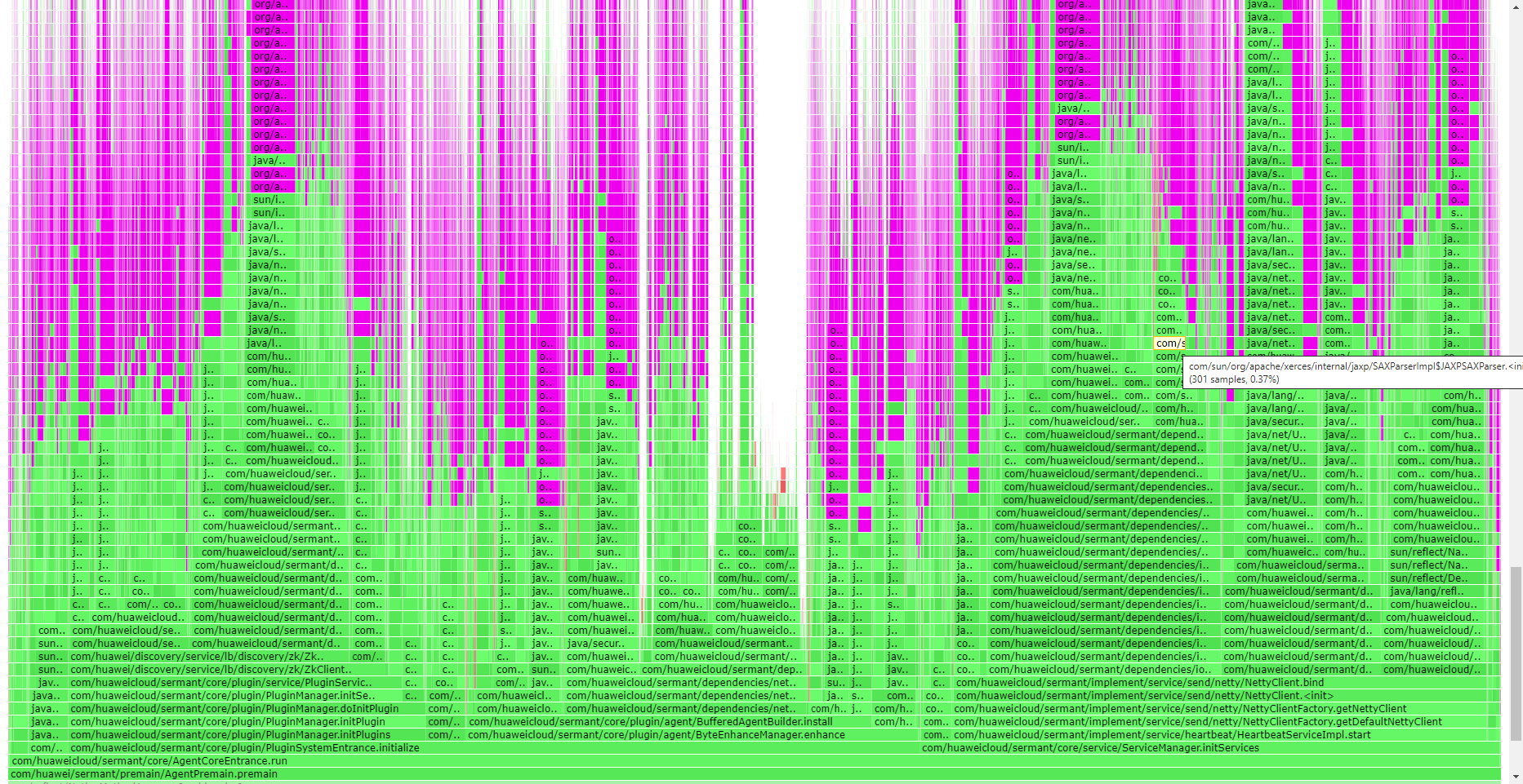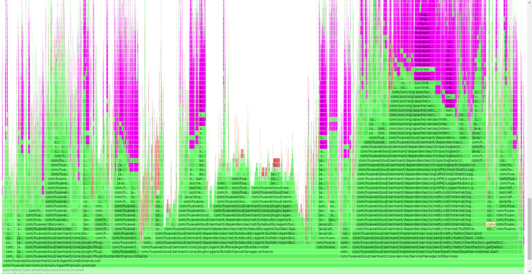 通过分析服务启动的CPU火焰图(见下图,紫色是Skywalking中ByteBuddy对Sermant进行增强前的类型扫描和字节码增强的CPU占用情况),发现SkyWalking使用的ByteBuddy对Sermant的类进行了字节码增强前的类型扫描,并进行了字节码增强,由于引入额外的JavaAgent组件,导致需要JVM加载的类增多,ByteBuddy在进行增强前的类型扫描时需要扫描的类也增多,最终导致服务启动耗时增加。并且在分析过程中我们也发现,ByteBuddy在进行扫描并且查找插桩点的过程中,基于模糊匹配(比如,通过类的父类,或者类所实现的接口来匹配)时,启动时的ByteBuddy所占用CPU时间片占用明显增多。