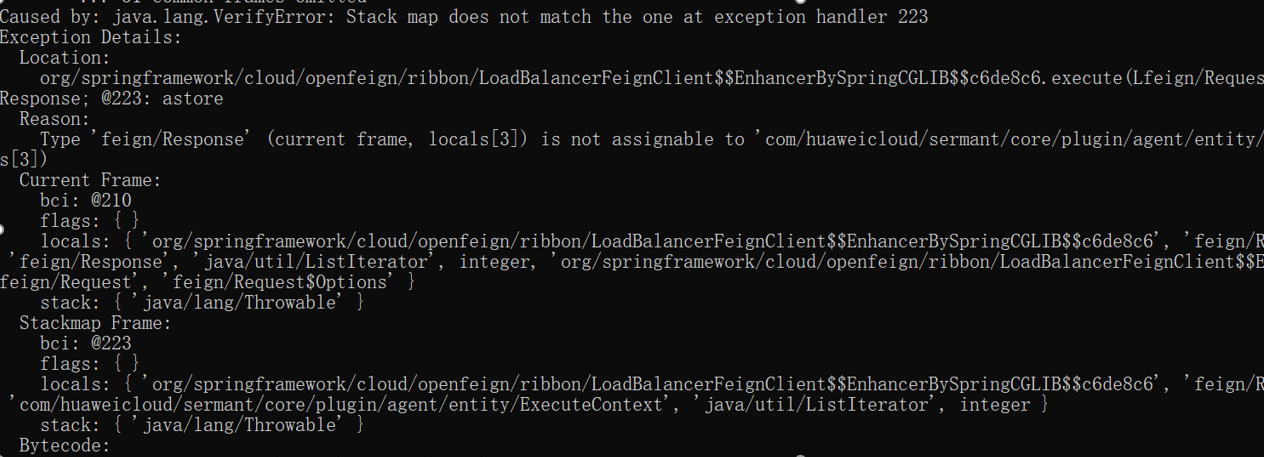 由于Spring使用CGLIB对LoadBalancerFeignClient进行增强时会创建代理类并修改方法参数和局部变量等字节码信息,因此当Sermant使用ByteBuddy对LoadBalancerFeignClient的代理类进行增强时,会出现字节码校验错误(由于该问题成因复杂,我们将在后续文章中对其进行深入分析) 。