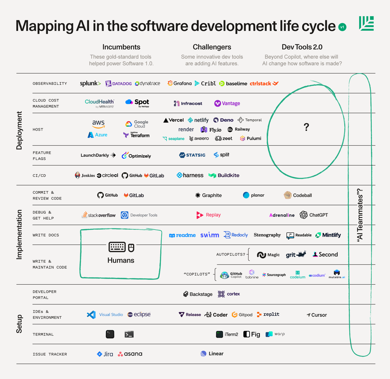 但在我们看来,AI可以改变软件工程领域,这是一个重要而巨大的机遇,问题在于谁能抓住它。我们认为,至关重要的因素将在专注于开发者体验、提供全新能力,以及做出战略性选择如何落地和扩展到开发者工作流程上。成功意味着重新定义工程实践方式,并有可能打造一家具有代表性的企业。