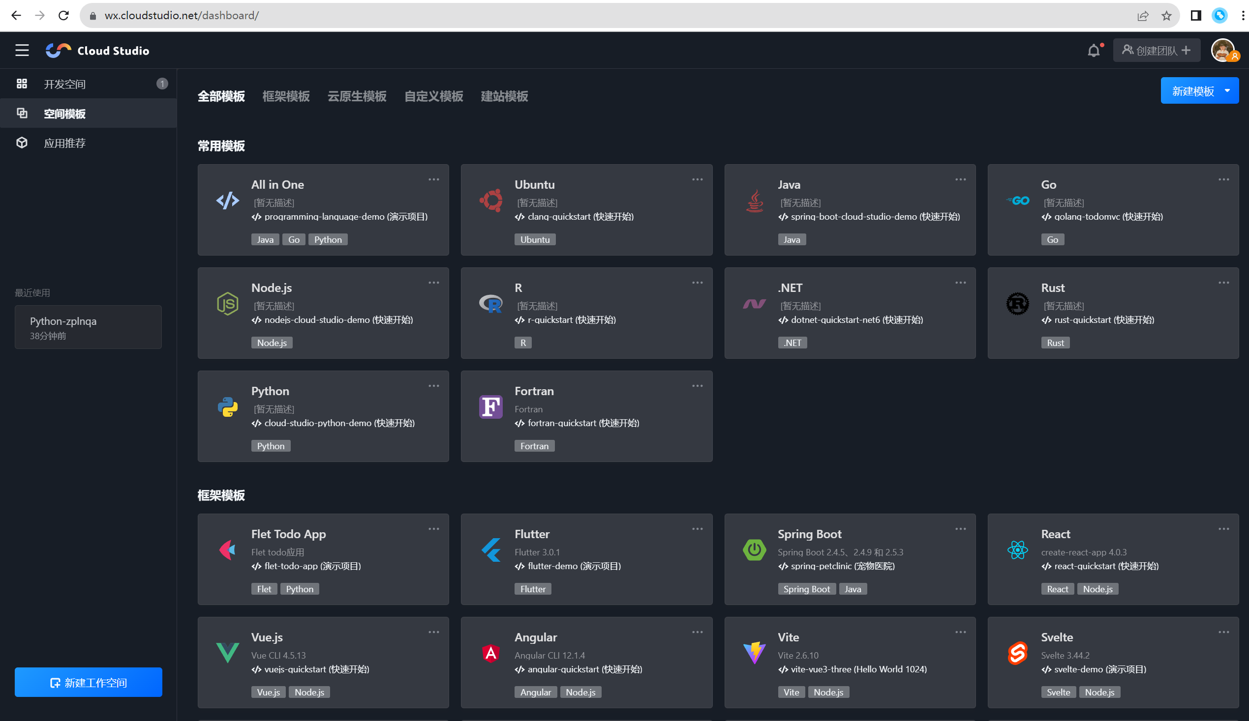 大家通过上图可以很清楚地看到,Cloud Studio为我们提供了很多语言的开发环境和框架模板。