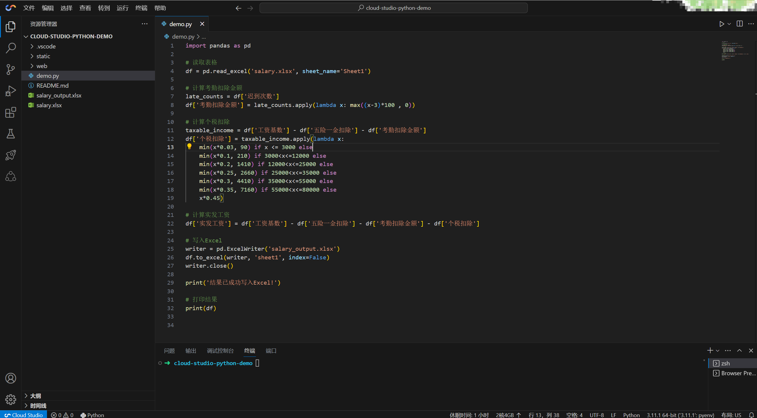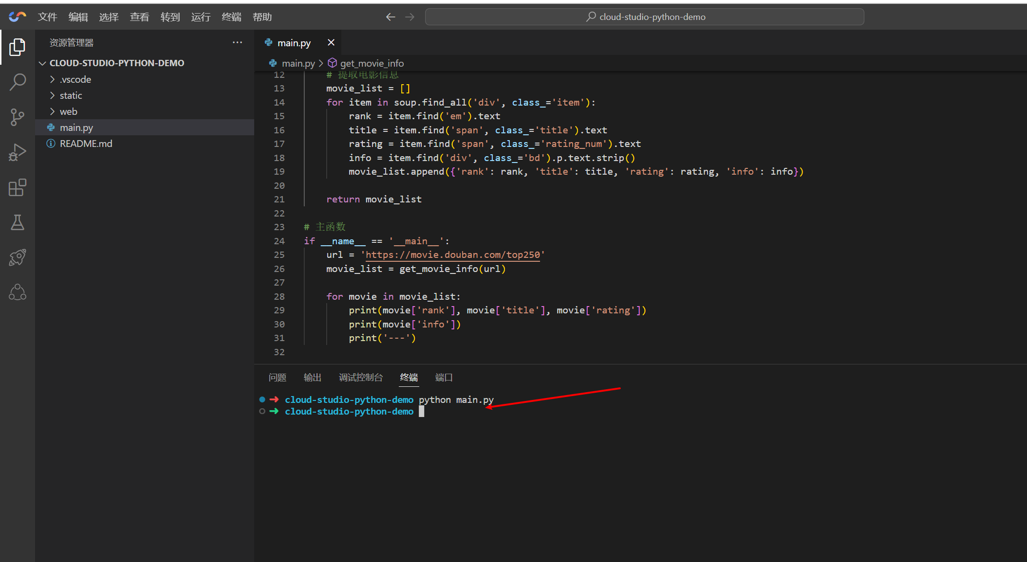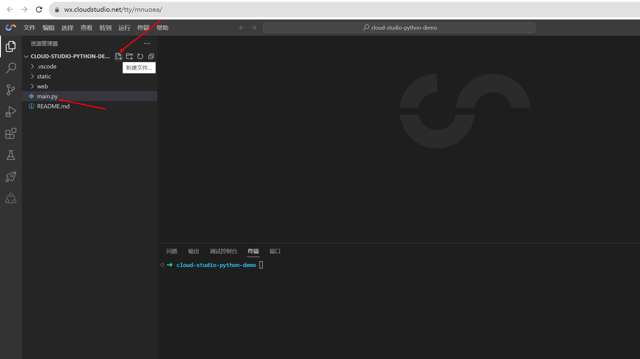 - 在Cloud Studio中创建要编写代码的文件。例如我的叫main.py