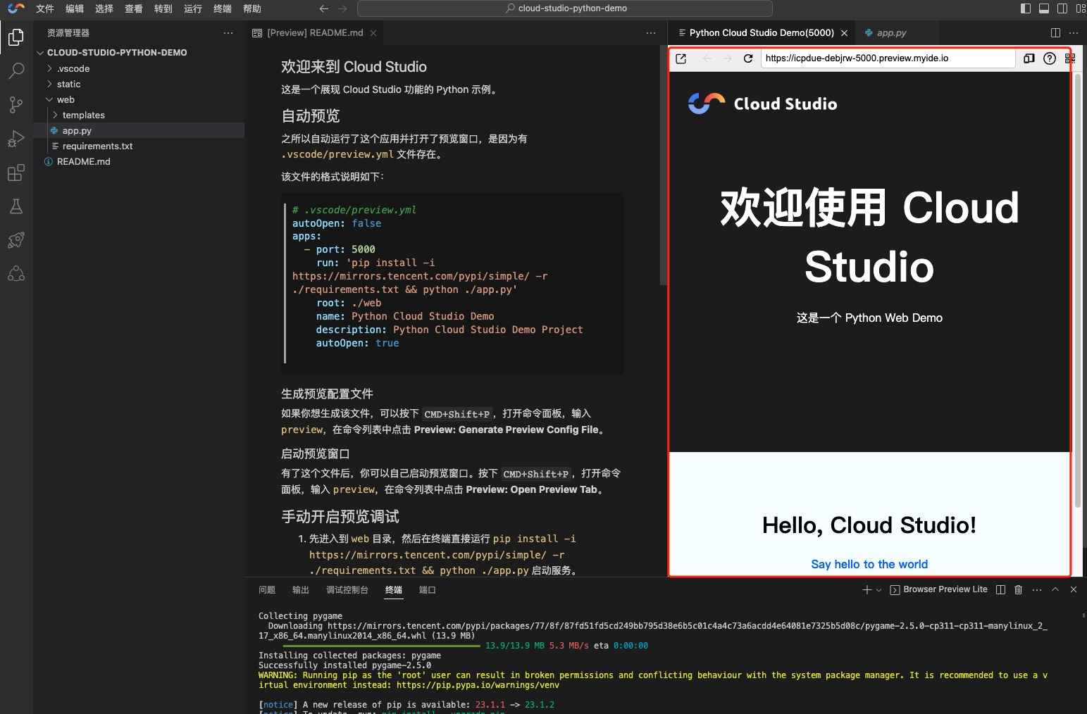 另外,Cloud Studio提供了灵活的扩展和定制选项。配备了丰富的开发工具和软件,比如集成开发环境(IDE)、版本控制系统、数据库管理工具等。而且,我们可以根据自己的需求自定义环境设置,安装所需的软件和插件。这使得我们可以快速搭建适合自己的开发环境。