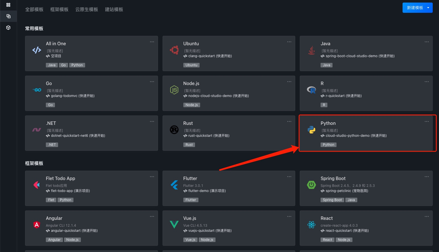 进入Cloud Studio控制台,选择‘常用模板’里名为‘Python’的模板点击即可: