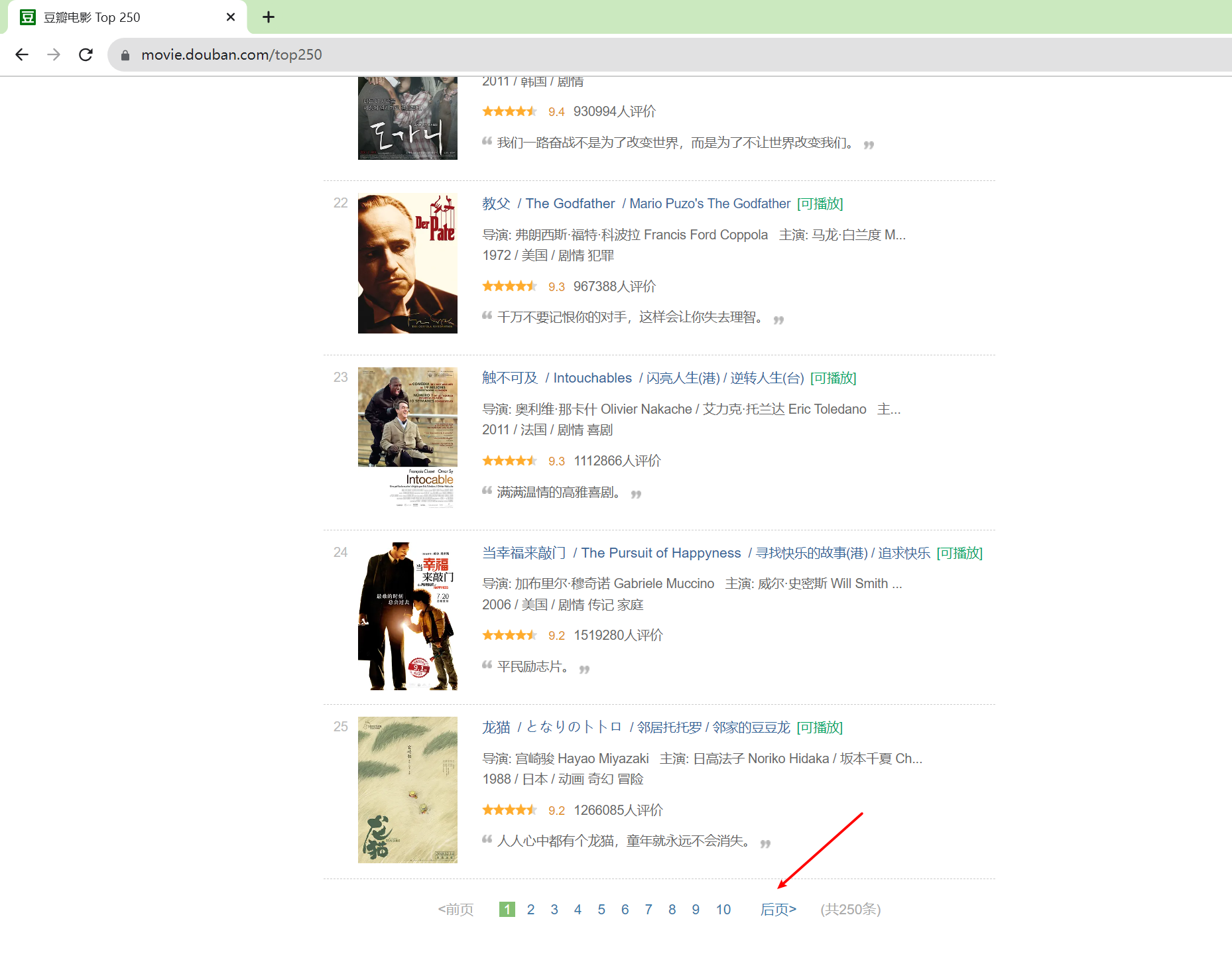 - 第三问——这个网站分页了,上面只能获取到第一页的电影数据,我想要获取所有250个电影信息。