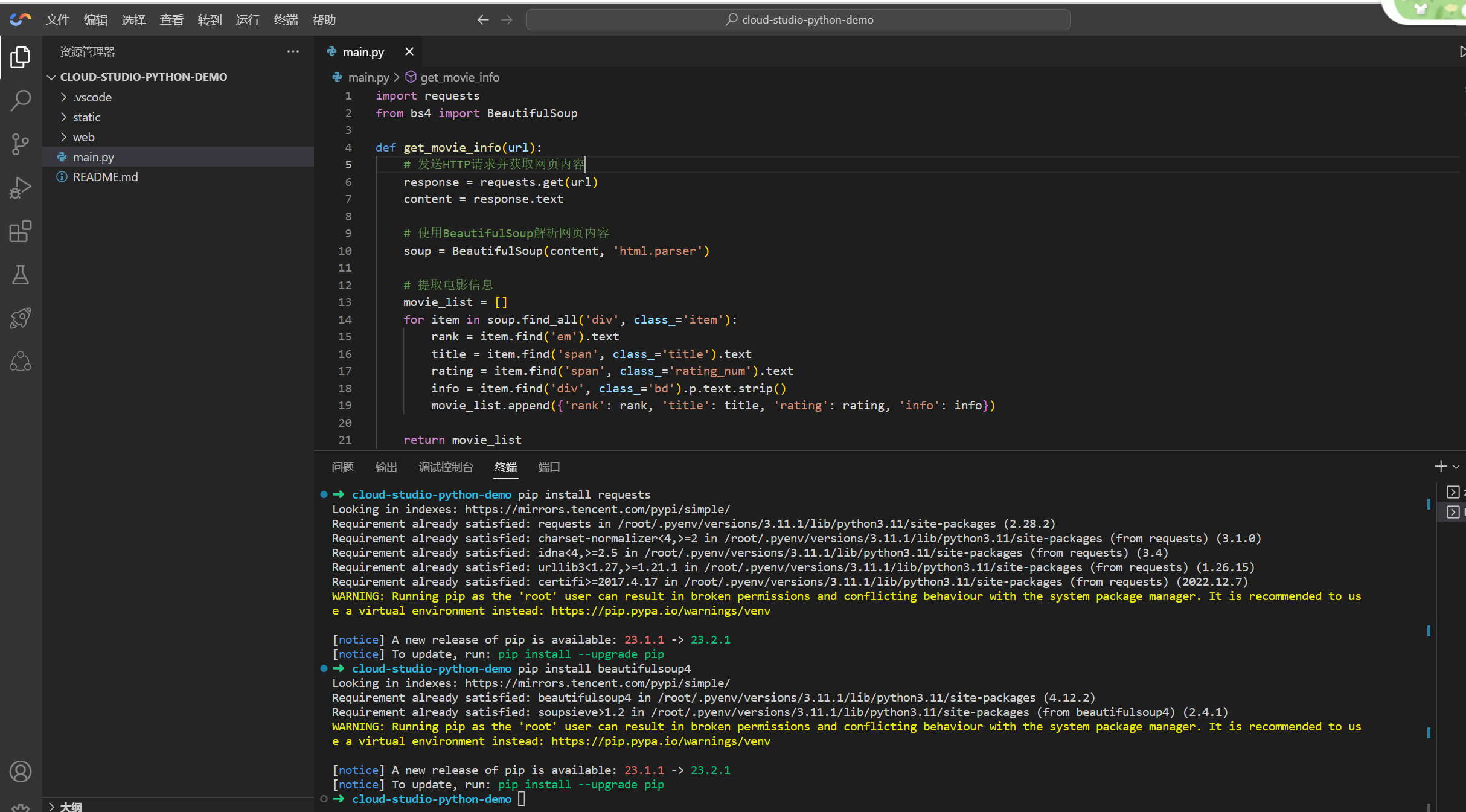 可以看到,Chatgpt甚至很贴心地告诉我们需要安装程序运行所需的库,并给了可以直接用的代码,所以使用Cloud Studio终端下载一下,如下第二个图。