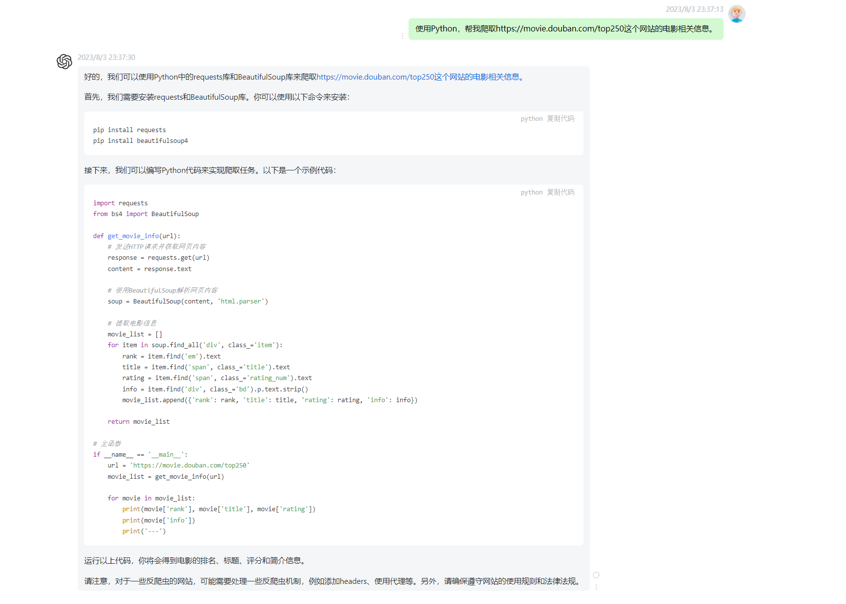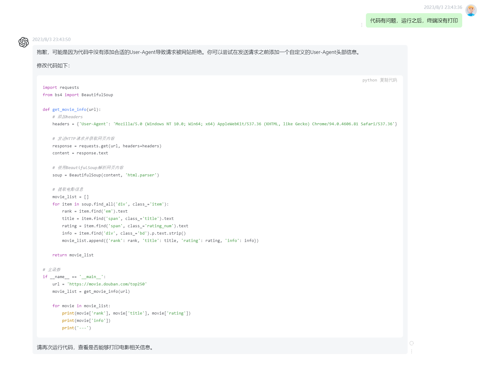 该准备的工具(Cloud Studio)都准备好了,爬取目标也十分明确(这个目标也是好多大学生大学生涯的某一次课外作业),如何正确对 GPT 发问,或者提需求其实是非常讲究的,并且作为一个拿到答案的人,你也一定要有辨别是非的能力;例如 GPT 告诉了你一串Python代码,尽管你一句都看不懂,但你还兴高采烈的CV代码中去运行导致和各种BUG对抗,但是对有辨别能力的人来说,一看 GPT 的回复代码立马能够找到问题,并且通过下一句话把这个“补丁”打好。