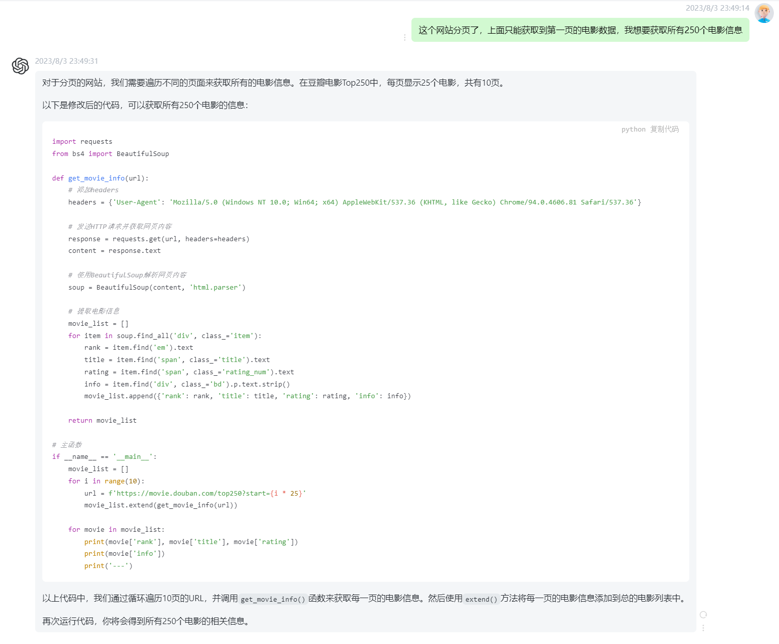 上面已经完成第一页电影信息的抓取,下面就通过念咒,控制ChatGpt来抓取多页,共计250个电影的信息。