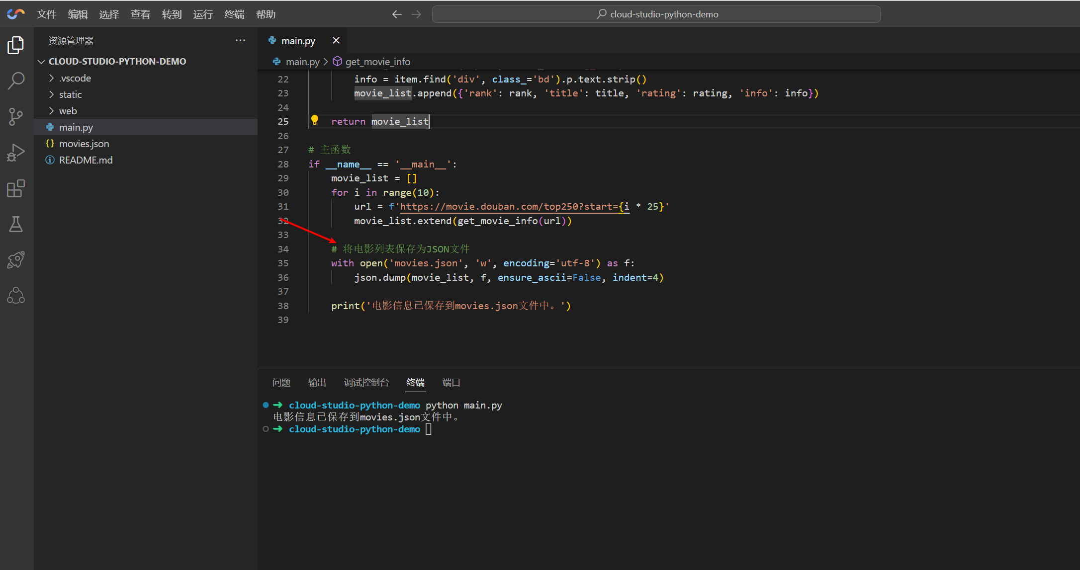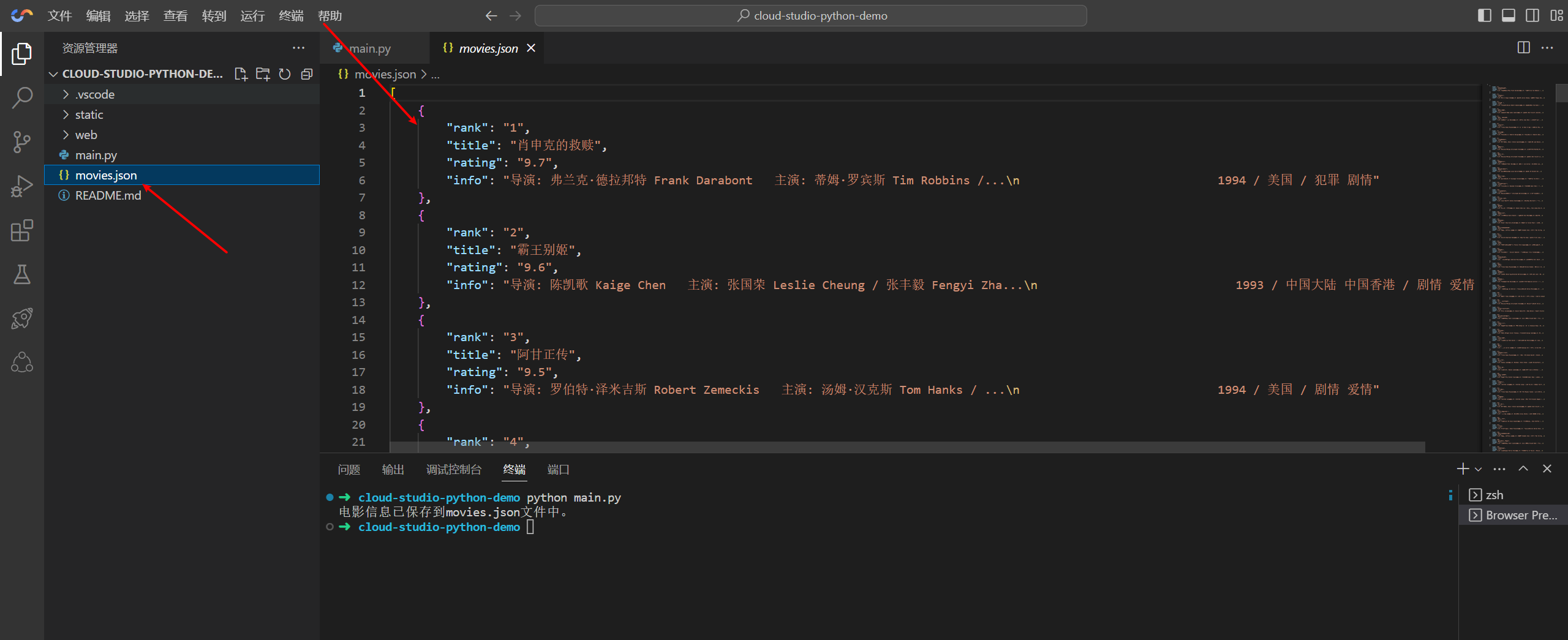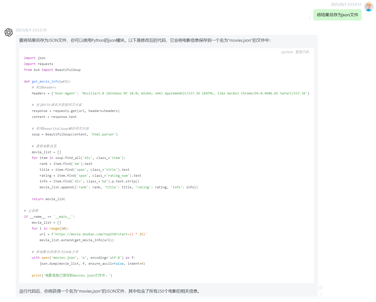 到目前为止,所有电影信息都已经获取成功,下面通过念咒让ChatGpt完成最后一个功能:另存为json文件。 - 第四问——将结果另存为json文件。