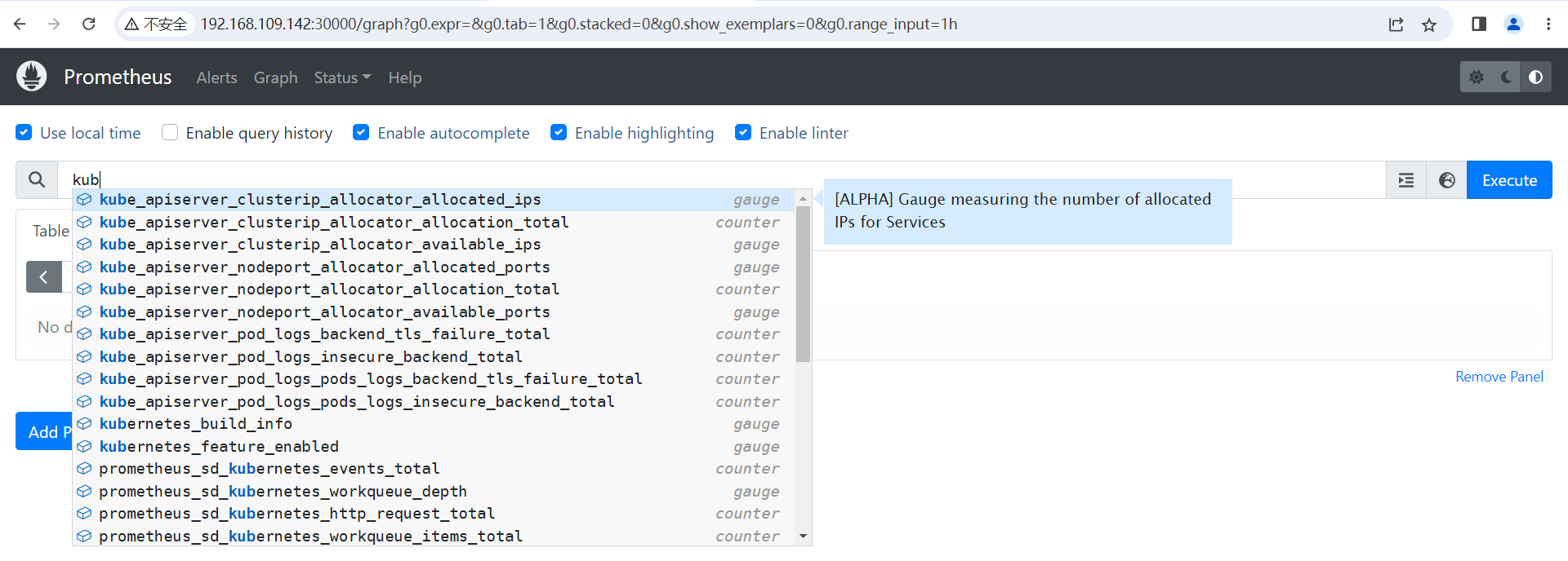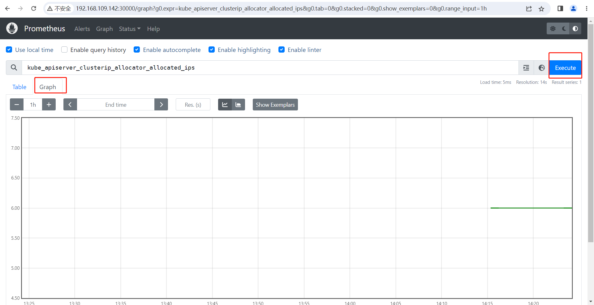 3.点击“Execute”按钮,并切换到“Graph”选项卡,可以看到指标的统计信息,如下图所示: