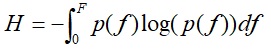 均匀分布函数为f(x)=1/F,对应的熵为:H1=log(F),那么频谱熵比Ep为:Ep=H/H1*100%。