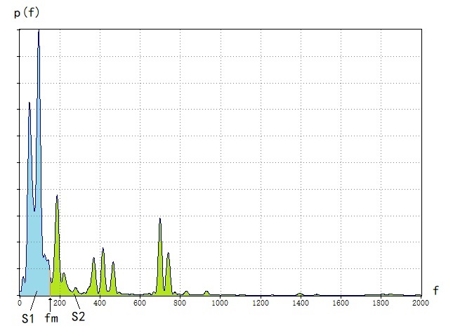 中值频率fm两边的曲线下面积相等,S1=S2=0.5,按此条件来计算中值频率fm。
