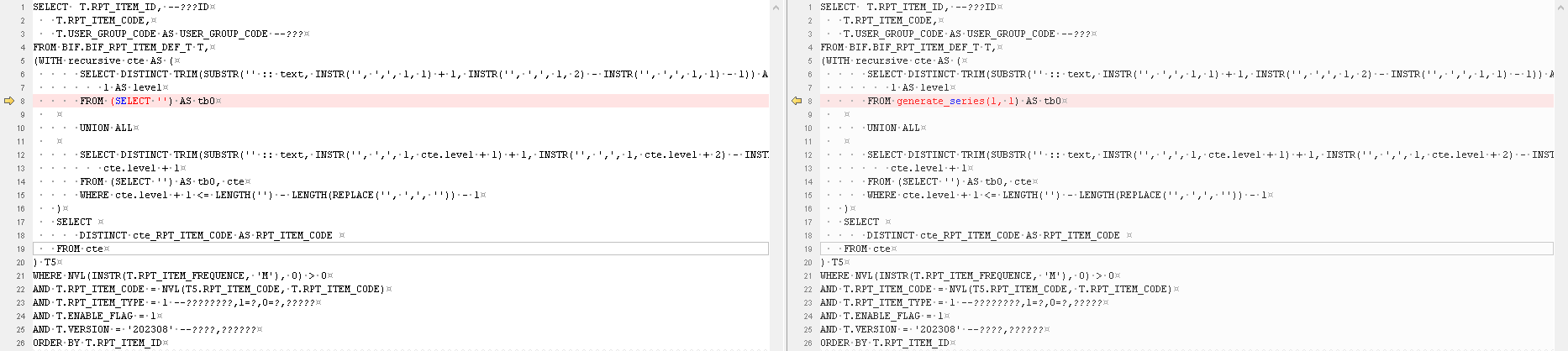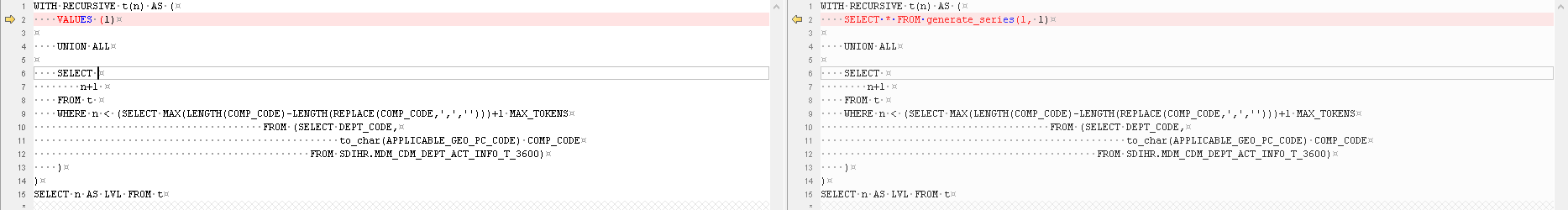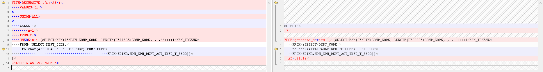 WHERE cte.level + 1 <= LENGTH('') - LENGTH(REPLACE('', ',', '')) - 1