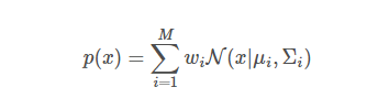 其中,$p(x)$表示数据$x$的概率密度函数,$M$表示高斯分布的数量,$w_i$表示第$i$个高斯分布的权重,$\mu_i$表示第$i$个高斯分布的均值,$\Sigma_i$表示第$i$个高斯分布的协方差矩阵,$\mathcal{N}(x|\mu_i,\Sigma_i)$表示以$\mu_i$为均值,$\Sigma_i$为协方差矩阵的高斯分布。