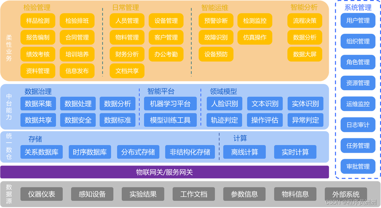 因为实验室的业务除了底层数据的接入、监测,更加涉及到如样品检验管理、资源管管理、运维管理、质量体系管理等一级、二级嵌套层级的业务架构。所以在设计业务框架时,可以进行如下设计: