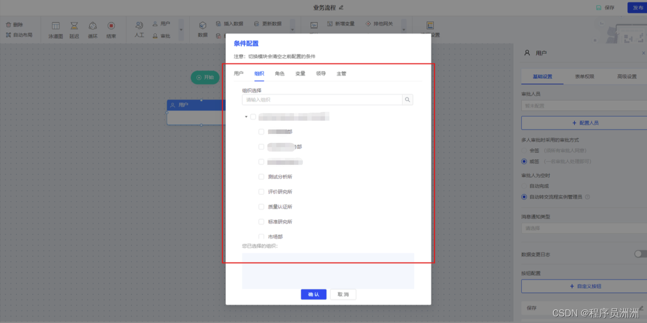 如样品在检测流程中,需要样品管理员进行样品分发后,样品负责人进行检测的逻辑。根据定义组织用户、角色可选择不同业务流程的处理角色。