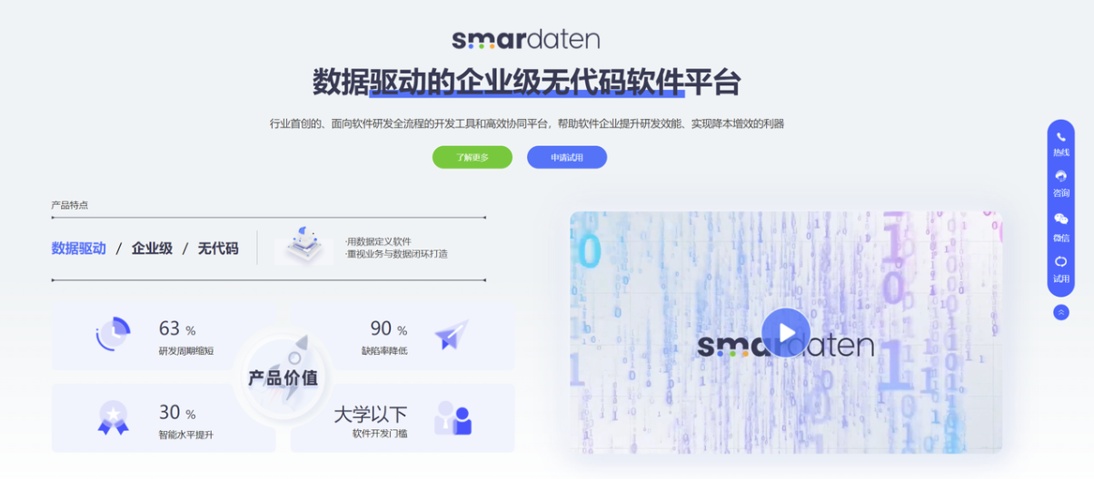 其实,smardaten作为数据驱动的企业级无代码软件开发平台,跟轻量级低代码平台还是有很大区别的。它内置了全域数据资产管理平台,包括数据资产管理、集成交换、计算,并基于这些数据来进行表单业务流程构建,以及可视化应用的的搭建。这也得得益于smardaten最早做大数据出生,有浓厚的大数据基因存在。当然对一些GIS空间分析、数字孪生的分析、交互式大屏,目前也有比较好的支撑。