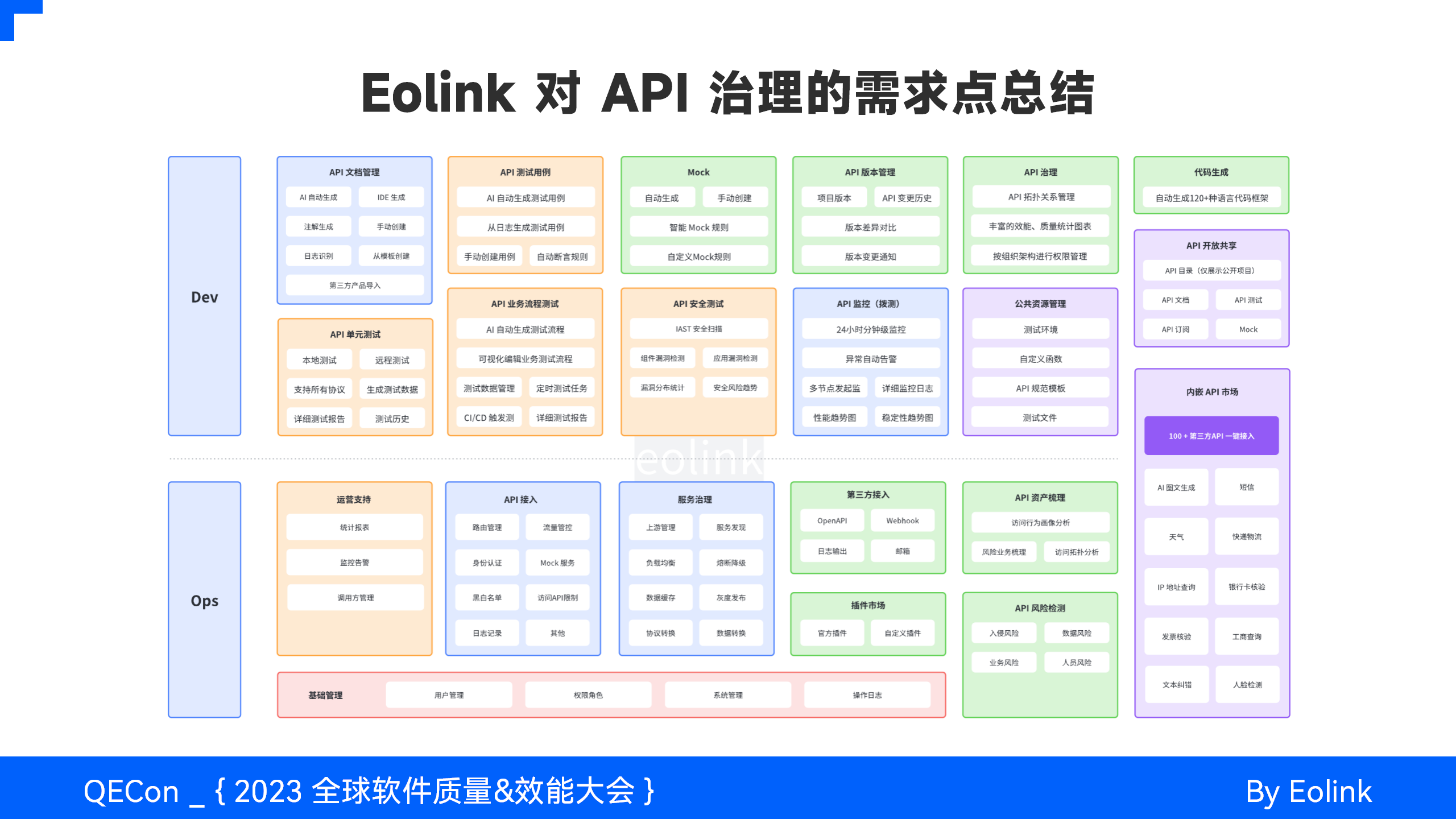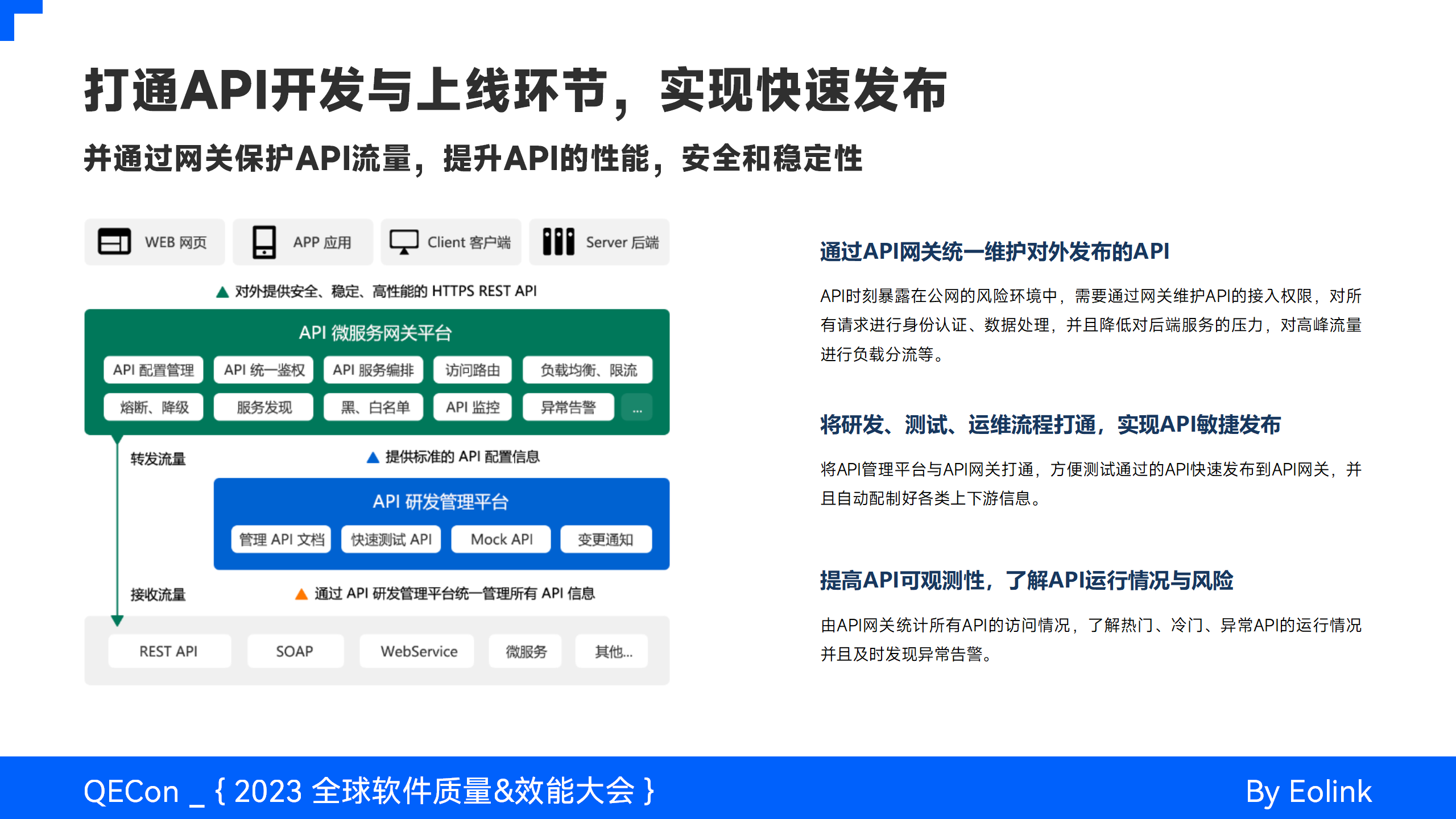 Eolink 从 2017年开始研究如何解决这些问题,并且针对性的设计和开发了一系列的 API 工具平台。包括 API 快速生产、研发管理、自动化测试、网关、监控、开放平台等,实现对 API 的全生命周期覆盖。