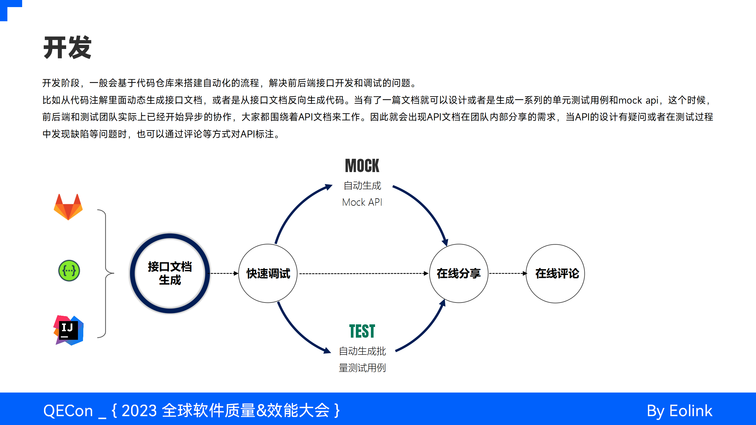 一般会基于代码仓库来搭建自动化的流程,解决前后端接口开发和调试的问题。比如从代码注解里面动态生成接口文档,或者是从接口文档反向生成代码。当有了一篇文档就可以设计或者是生成一系列的单元测试用例和 Mock API。这个时候,前后端和测试团队实际上已经开始异步的协作,大家都围绕着 API 文档来工作。