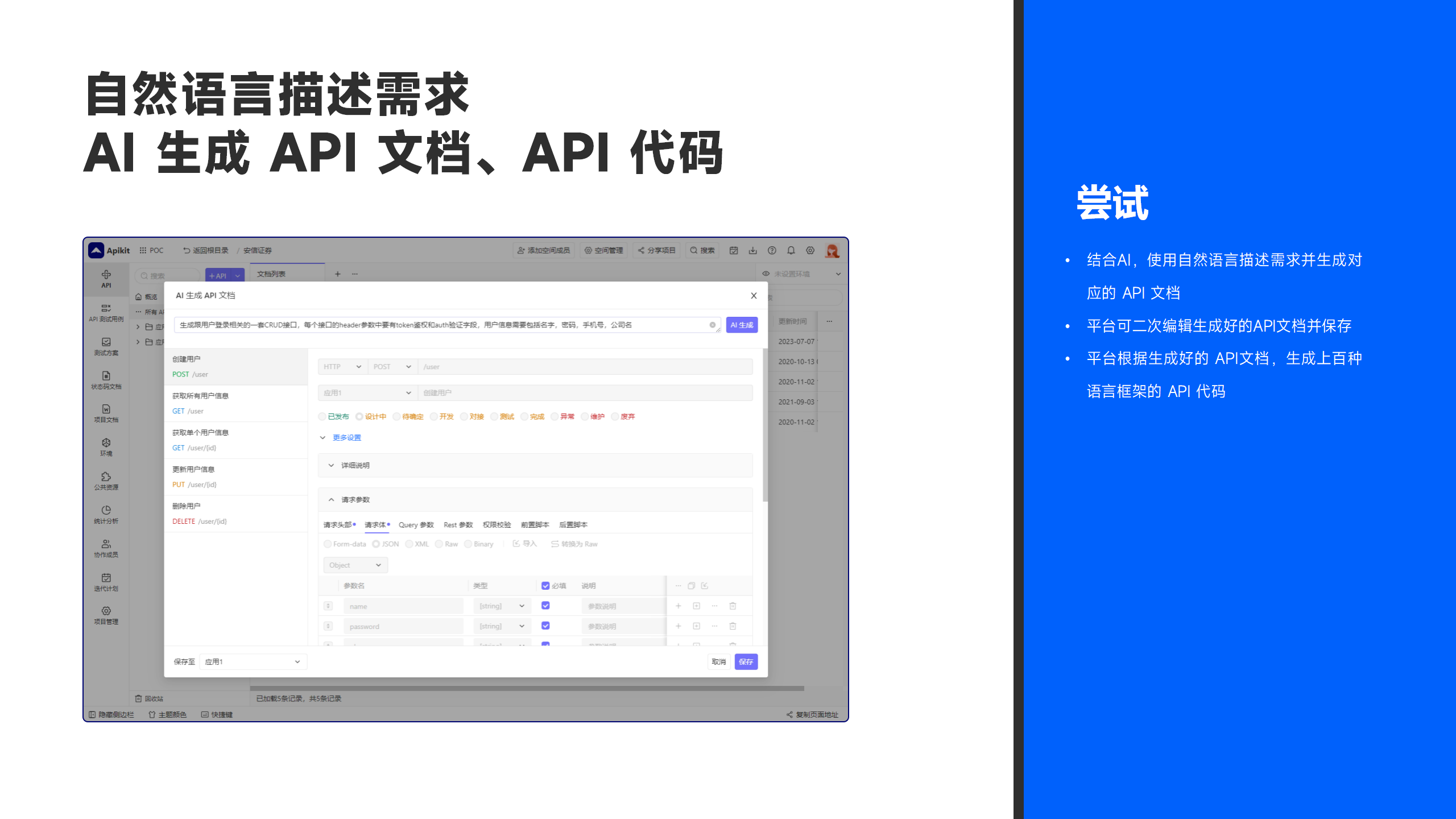 1. 通过自然语言描述需求,AI 生成 API 文档、API 代码