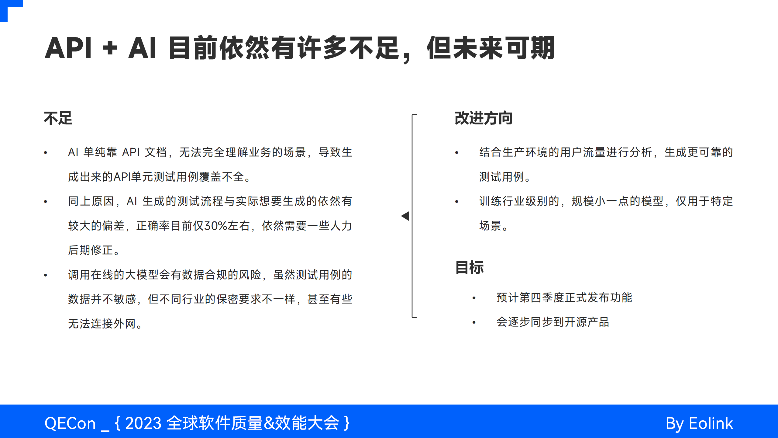 上述的三个功能目前在进行小范围的用户内测,内测过程中,我们也发现了一些问题要改进。比如通用大模型 AI 由于缺少高质量的 API 的训练数据,没有办法完全理解 API 的使用场景,尤其是一些专业领域的 API,或者是基于内部需求而设计的 API,导致生成出来的 API 单元测试的用例覆盖不全,或者生产出来的正确率比较低,目前我们内测发现正确率在 30% 左右,后期依然需要一些人工进行修正。