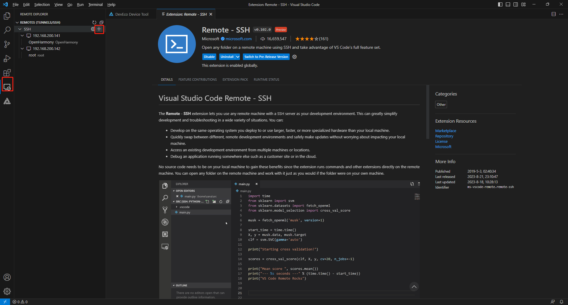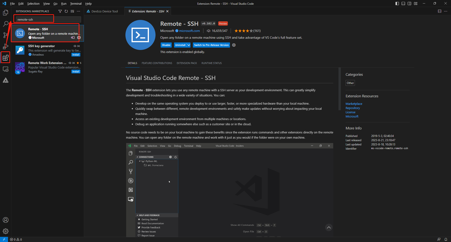 打开Windows系统下的Visual Studio Code,在插件市场的搜索输入框中输入“remote-ssh”,并安装