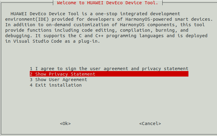 通过收到控制选择1同意协议进行安装,安装完成后,当界面输出“DevEco Device Tool successfully installed.”时,表示DevEco Device Tool安装成功。