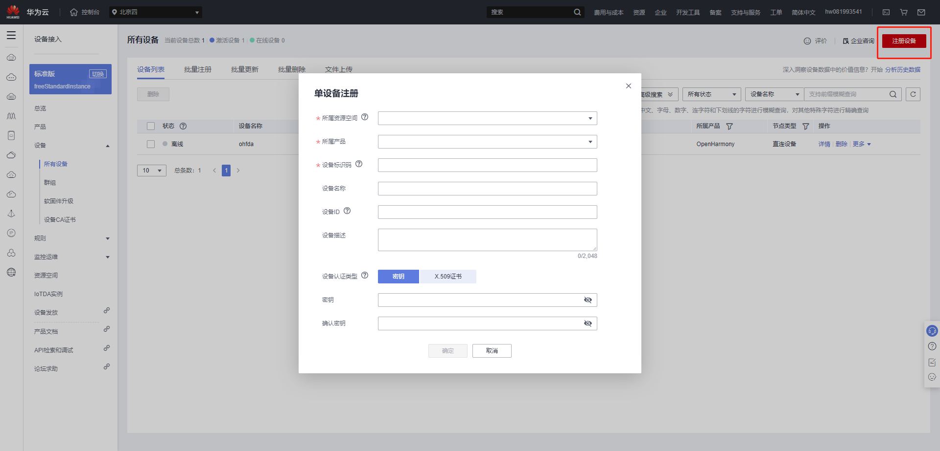 - 设备认证类型:密钥