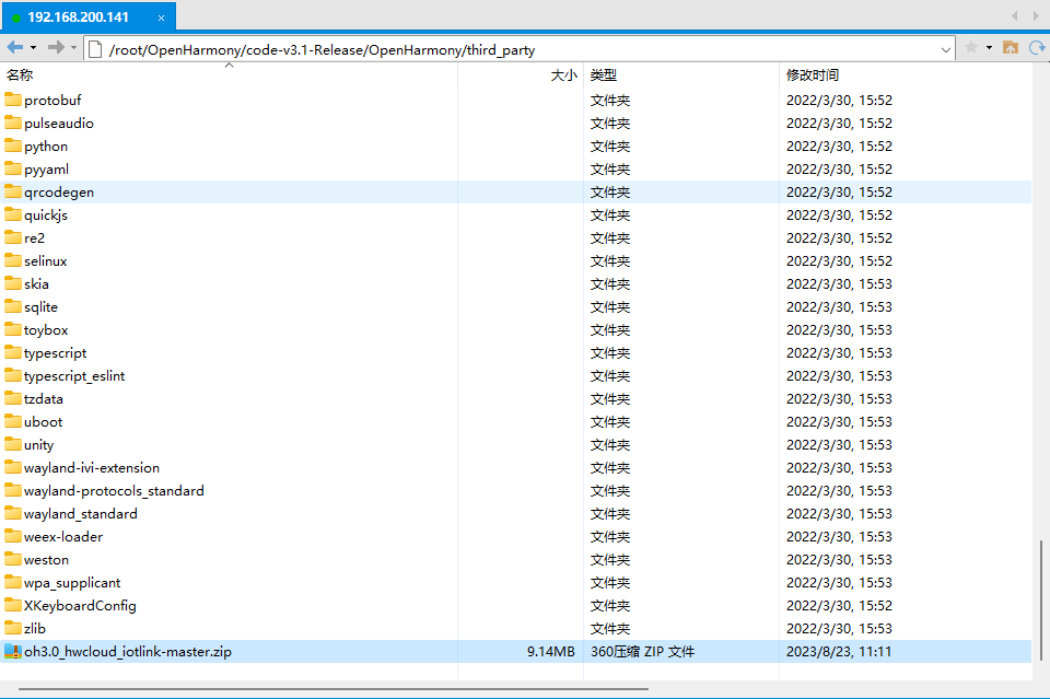 首先下载sdk,这里使用的3.0,但是我们使用的系统是3.1 这里有两个目录需要我们修改一下,oh3.0_hwcloud_iotlink-master.zip直接拷贝到OpenHarmony源码根目录下的third_party目录中。
