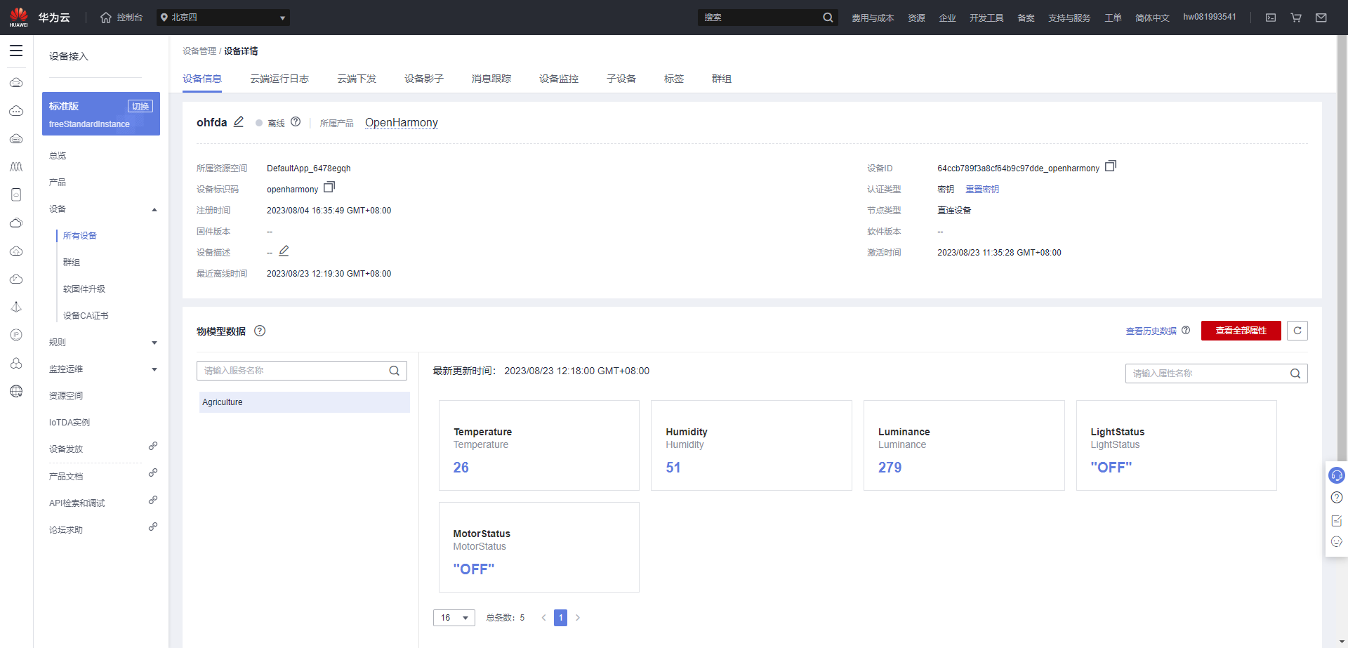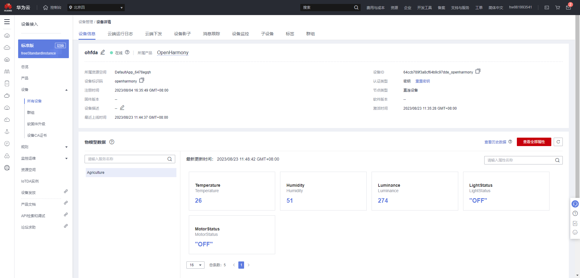 重新上电后,界面提示如下信息时,表示烧录成功。打开iotda的控制台设备中可以看到设备已经上线,打开设备可以看到其中具体参数